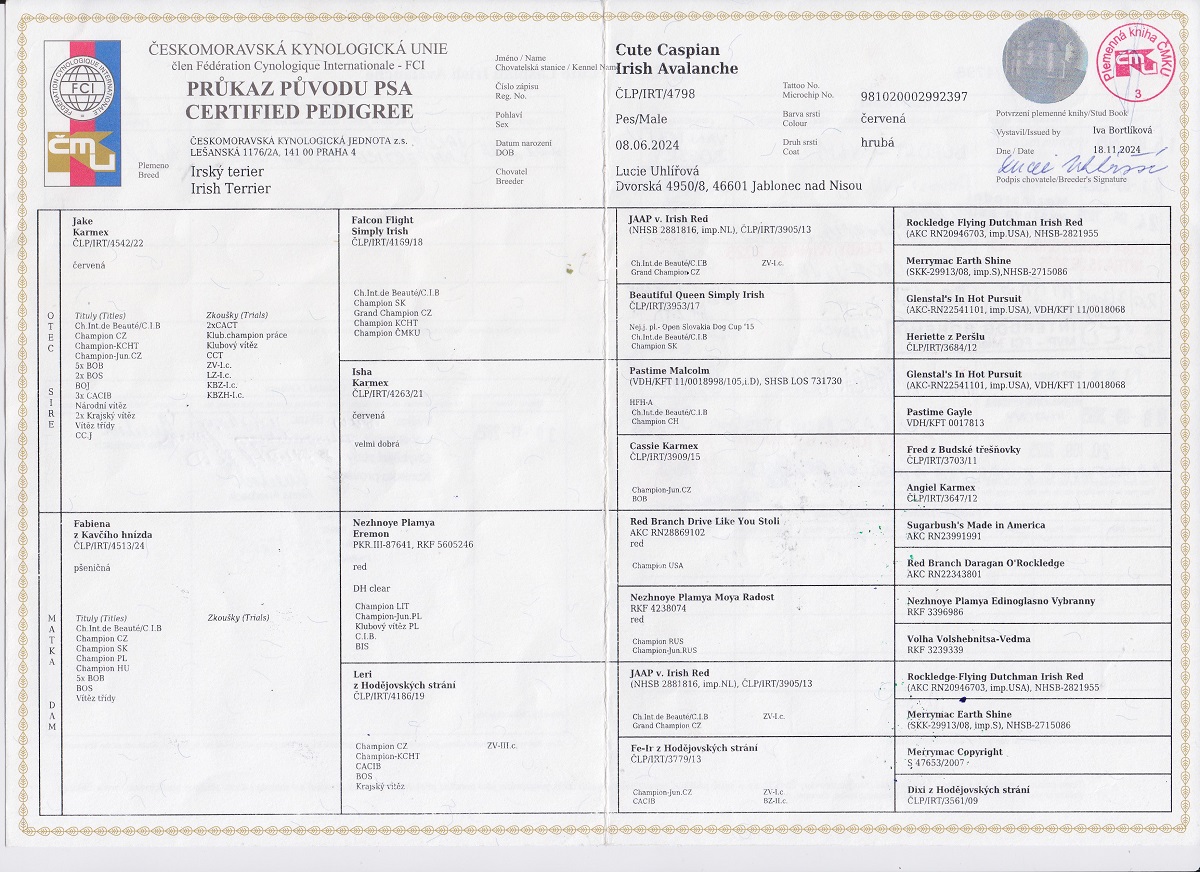 | 04.10.2025 | Mezinárodní (CACIB) České Budějovice/ | Petr Řehánek/CZ | otevřená | V1, CAC, CACIB, BOB /10 b. |