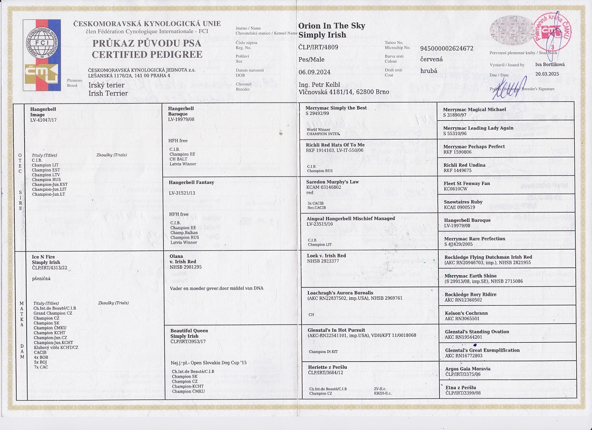 13.09.2025 | Mezinárodní (CACIB) Olomouc/ | Alexandra Grygarová/CZ | mladých | V1, CAJC, BOJ, BOB /10 b. |